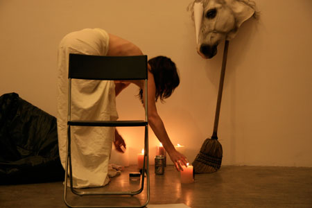 Tolentino could have been a Gauguin model, with the face and body of the Proto-Woman. Leaning against the wall, Christ-like, her face upturned to the heavens, Tolentino was both agonized and ecstatic. A golden cord, hung from on-high, directed a river of raw honey into her open mouth. Was she choking? Drowning? Was she orgasmic? The sweet manna slowly covered the artist in a glossy glow.